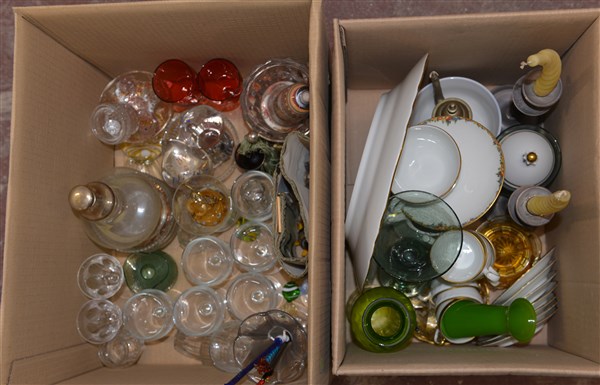 Lotto di due scatoloni contenenti oggetti di diversa forma ed uso in vetro, porcellana e metallo (difetti)