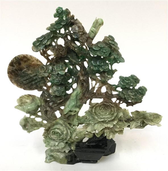 Scultura in pietra dura raffigurante un vaso con volatili tra rami in fiore (h cm 30) (difetti) Cina, sec. XX