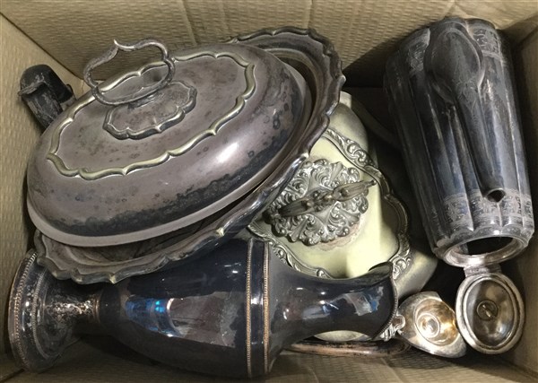 Lotto 2116 | Cartone contenente alcuni oggetti da tavola in metallo e metallo argentato (dif