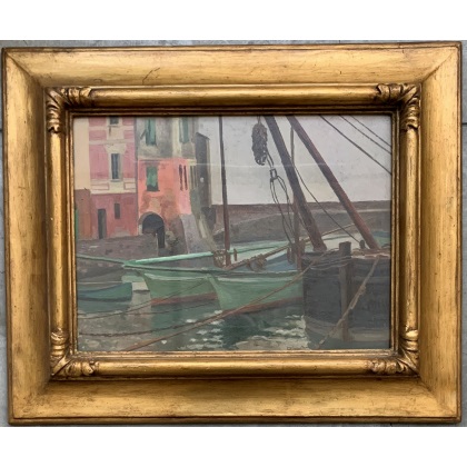 Firma indecifrata "Camogli, il porto" 1936, olio su tavola (cm 30x40) Firmato e datato in basso a destra. In cornice (lievi difetti)