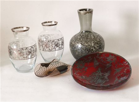 Lotto composto da una coppia di vasi, un vaso a boccia e due centrotavola con decorazioni diverse in foglia d'argento (difetti)