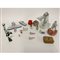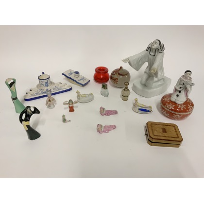 Lotto composto da vari oggetti tra i quali alcune sculture in porcellana, un vasetto in ceramica, un vasetto in vetro, un calamaio in porcellana e una scatolina in legno. (lievi difetti)