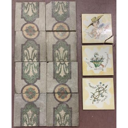 Lotto di due cartoni contenenti formelle in micrograniglia di marmo unite a tre formelle della Società Cooperativa Imola e della serie "I fiori". (difetti)