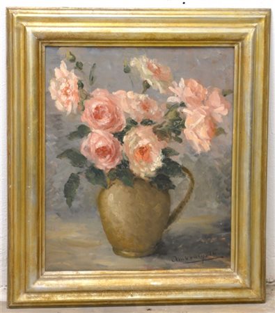 Firma indecifrata "Vaso con fiori" olio su compnsato (cm 55x47) firmato in bass