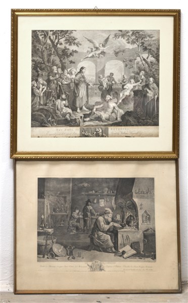 Lotto di due incisioni del secolo XIX di soggettie misure diverse, in cornici (difetti)