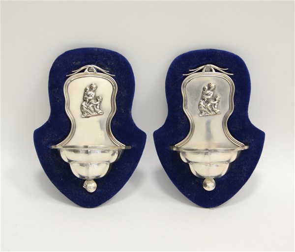 Coppia di piccole acquasantiere in argento martellato decorate da Madonna con B