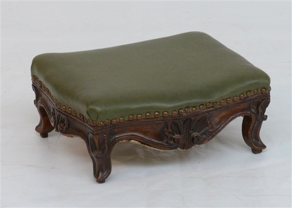 Poggiapiedi in noce intagliato a volute e motivo di conchiglia, secolo XIX (dif