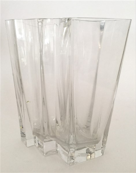 Vaso in vetro trasparente incolore di forma poligonale leggermente svasato. Esecuzione recente. (h cm 24,5) (lievi difetti)