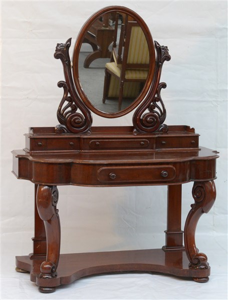 Mobile da toilette in mogano con cassetto nella fascia, piano e gambe anteriori a sagoma. Alzatina con specchio ovale basculante centrale a tre cassettini (cm 120x157x63) (difetti)