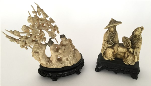 Lotto composto da un gruppo in avorio ed uno in resina, basi in legno (difetti)