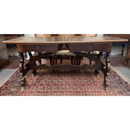 Tavolo scrittoio in noce con due cassetti sottopiano, sostegni a lira e travers