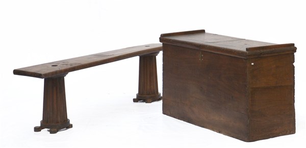 Lotto composto da una vecchia madia doppia in legno (cm 124x68x45) e una panca con gambe a colonna scanalata (h cm 176) (difetti e mancanze)
