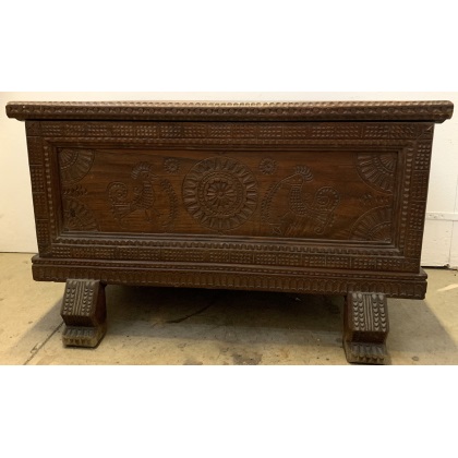 Piccola cassapanca in legno con fronte intagliato a rosoni e animali stilizzati
