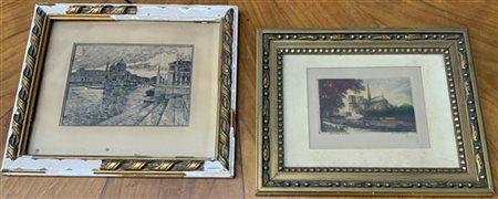 Lotto composto da due acqueforti raffiguranti la Chiesa di San Simeone Piccolo a Venezia e la Cattedrale di Notre Dame a Parigi (cm 11x16), in cornici (difetti)
