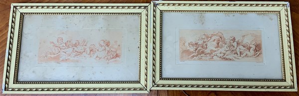 Coppia di incisioni a sanguigna da Boucher raffiguranti giochi di putti (cm 18x30), in cornici (difetti)
