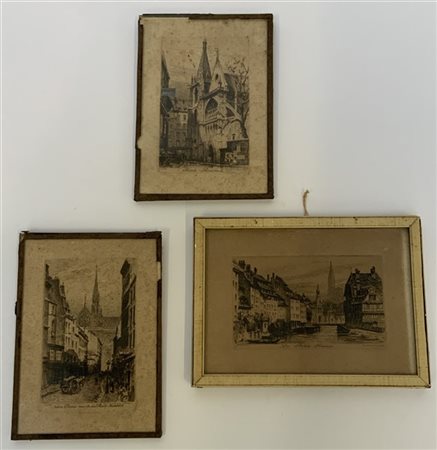 Lotto composto da tre piccole acqueforti raffiguranti scorci di Parigi e Strasburgo, misure diverse (max cm 12x17), in cornici (difetti)