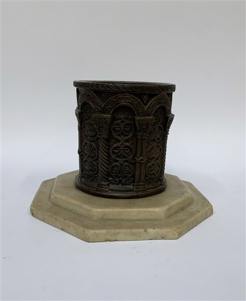 Modello di pozzo medievale in bronzo decorato in rilievo su base ottagonale in marmo (h cm 21) (lievi difetti)