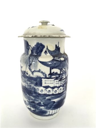 Vaso in porcellana bianca e blu decorato con paesaggio. Cina, inizio sec. XX (h