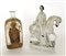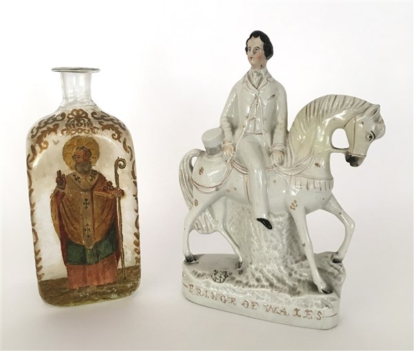Manifattura veneziana, secolo XVIII. Una bottiglia in vetro decorata in policromia con figura di S. Nicola di Bari unita ad una figura di cavaliere in ceramica inglese del secolo XIX (difetti)