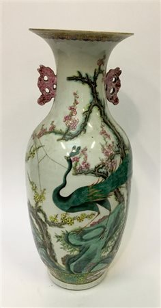 Vaso biansato in porcellana policroma decorato con rami fioriti e pavone (h cm 59) (difetti e vecchi restauri)