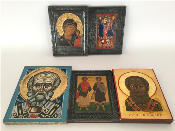 Lotto composto da cinque icone raffiguranti santi e Madonna con Bambino (difetti)