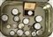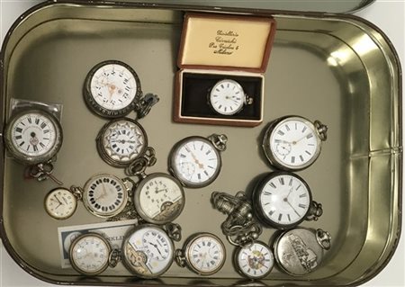 Scatola in latta contenente quindici orologi da taschino in argento e metallo, misure diverse. (difetti)
