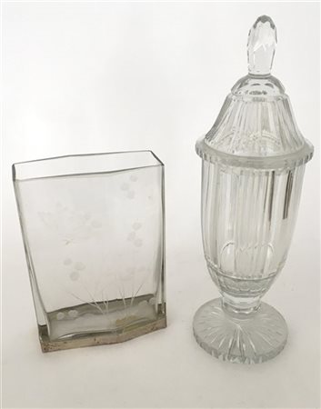 Lotto composto da un vaso in vetro inciso a farfalle e fiori con base in argento ed uno in cristallo con coperchio (difetti)