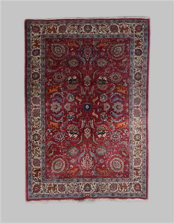 Decoro con scene di caccia policrome su fondo rubino. Bordura a fondo bianco con tigri e cerbiatti (cm 306x200) (lievi difetti)