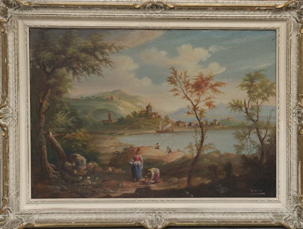 Ignoto "Paesaggio lacustre con figure" olio su tela (cm 70x100) firmato