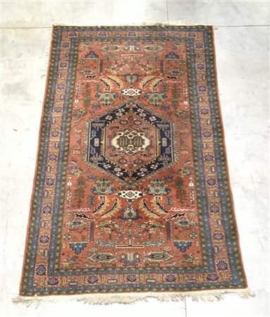 Tappeto caucasico di moderna manifattura decoro geometrico policromo su fondo mattone (cm 270x167) (difetti e rotture)