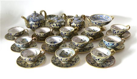 Servizio da tè in ceramica decorata a lustro a motivi vegetali e nel cavetto con volti rinascimentali. Composto da: teiera, lattiera, zuccheriera, dodici tazze e quindici piattini (difetti)