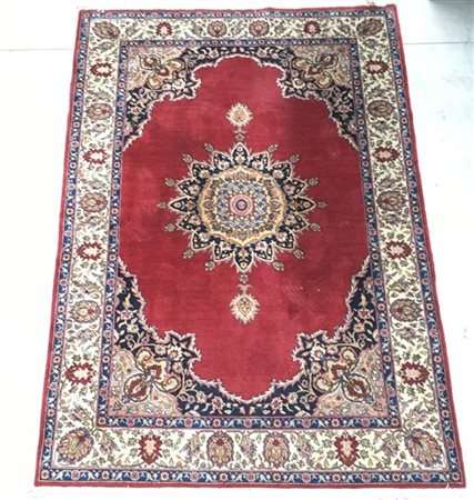 Tappeto kirman Romania sec. XX decoro a medaglione stellato policromo su fondo rubino (cm 300x202) (lievi difetti)