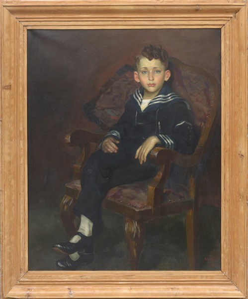 Janos Viski "Ritratto di bambino in poltrona" 1930 olio su tela (cm 120x100) firmato e datato in basso a destra, in cornice (difetti e restauri)