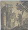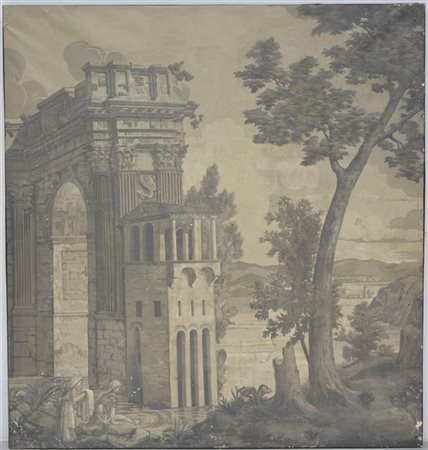 Grisaille su carta applicata su tela raffigurante struttura architettonica in un paesaggio con figure (cm 165x156) (difetti e restauri)