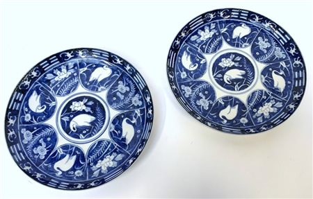 Coppia di piatti in porcellana bianca e blu decorati con aironi e trigrammi taoisti, marchio apocrifo alla base (d. cm 24) (difetti)