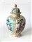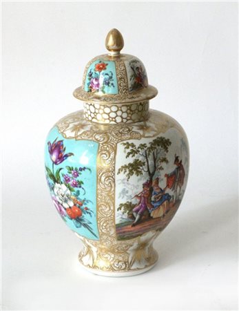 Vaso con coperchio in porcellana, decorato a cartigli dipinti in policromia con scene galanti e mazzi di fiori, e fregi in oro (h cm 35) (difetti)