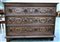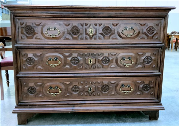 Antico comò in noce a tre cassetti intagliato sul fronte e sui fianchi a rosoni