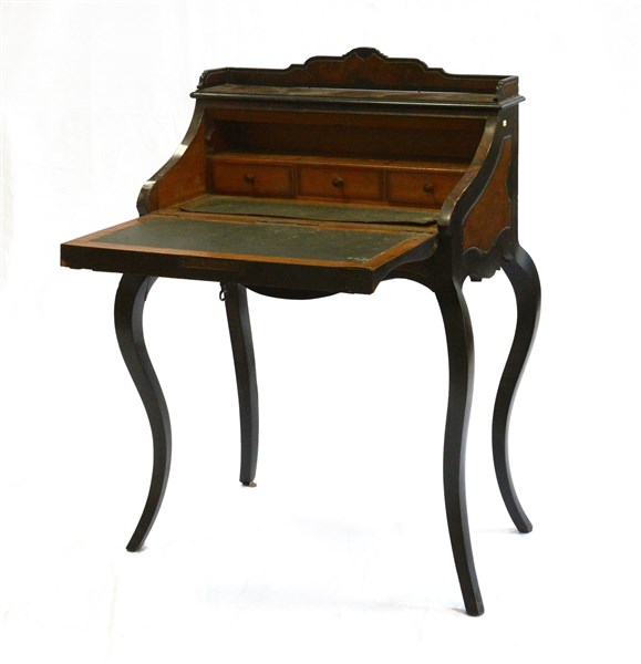 Scrittoietto a ribalta lastronato in radica ed ebanizzato, calatoia celante tre cassettini e vano, un cassetto, quattro gambe sagomate (cm 74 x 102 x 45) (difetti e mancanze)
