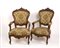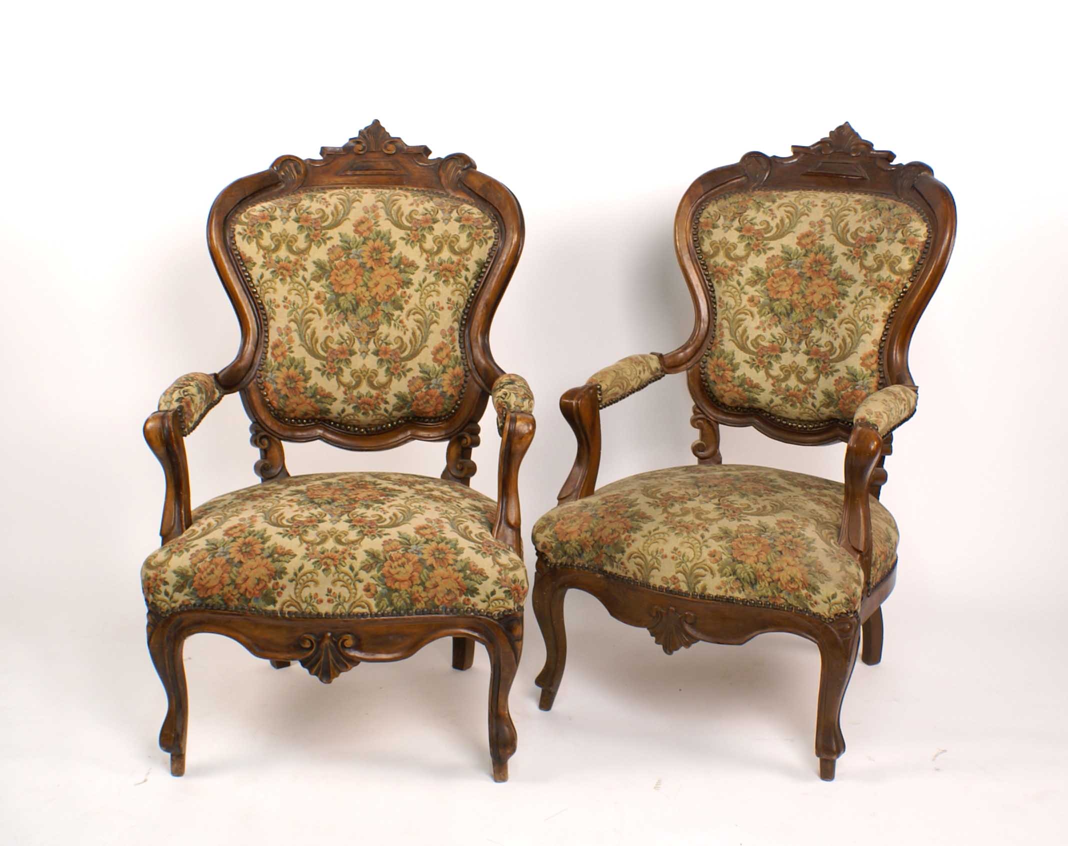 COPPIA DI POLTRONE IN NOCE vecchia manifattura Con schienali e sedute imbottiti e rivestiti in tessuto H. 110 cm.