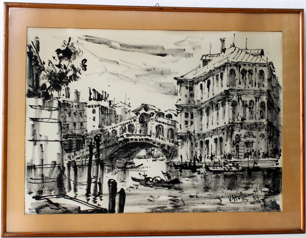 Firma indecifrata "Venezia, Ponte di Rialto" china nera su cartoncino cm 50x70