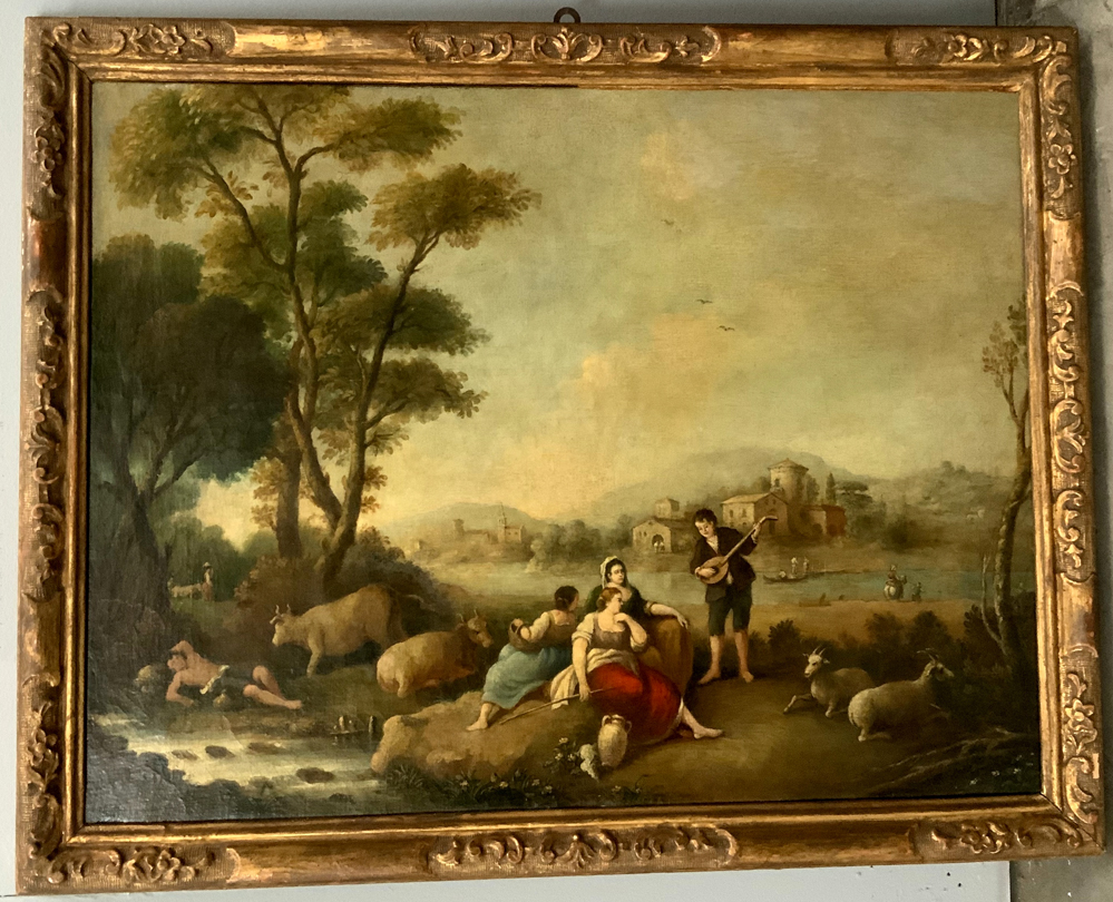 Scuola del secolo XIX "Scena bucolica in paesaggio fluviale " olio su tela (cm 49,5x65) In cornice (difetti e restauri)