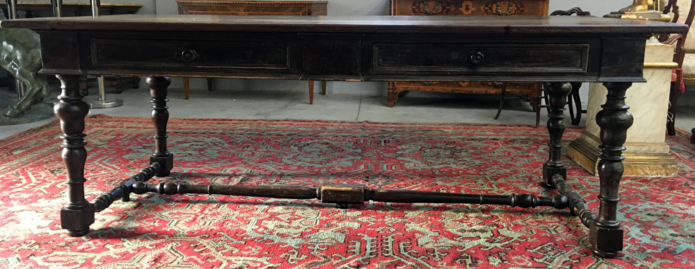 Scrivania da centro con due cassetti nella fascia, gambe tornite e riunite da traverse (cm 225x80x94 (difetti e restauri)