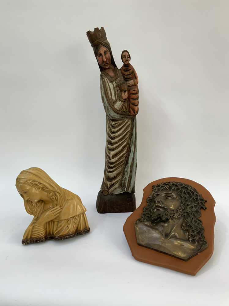 Lotto composto da un bassorilievo in bronzo raffigurante il volto di Cristo, una scultura lignea raffigurante Madonna con Bambino e un bassorilievo col volto di Maria (h max cm 65) (difetti)