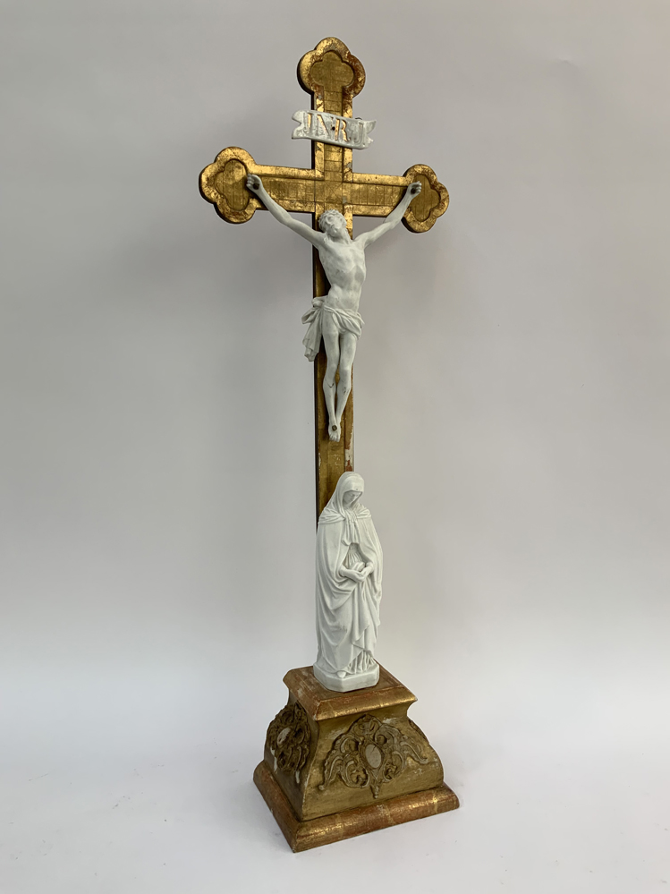 Crocefisso da tavolo con struttura in legno dorato e figure di Cristo e Maria in biscuit (h cm 87) (difetti)
