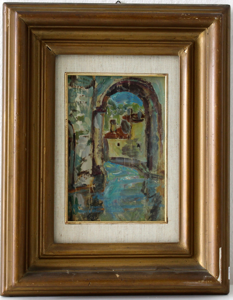 Ignoto "Canale con edifici" olio su carta cm 19x13. In cornice (difetti)