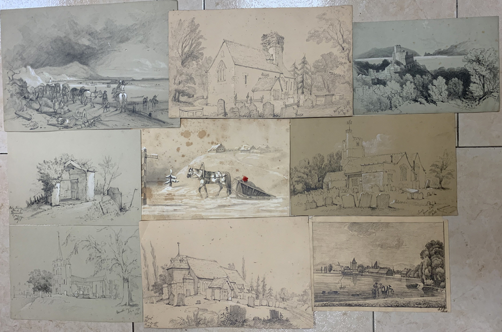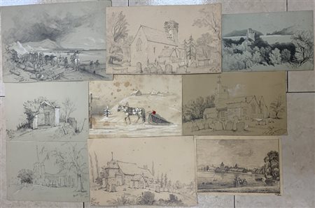 Cartelletta contenente nove tra incisioni e disegni a matita e biacca di autori, soggetti e misure diverse (difetti)