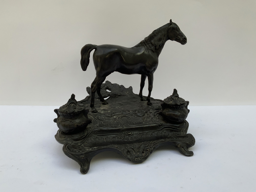 Calamaio in bronzo con basamento mosso sormontata da cavallo, firmato Mène alla base (h cm 22) (difetti)