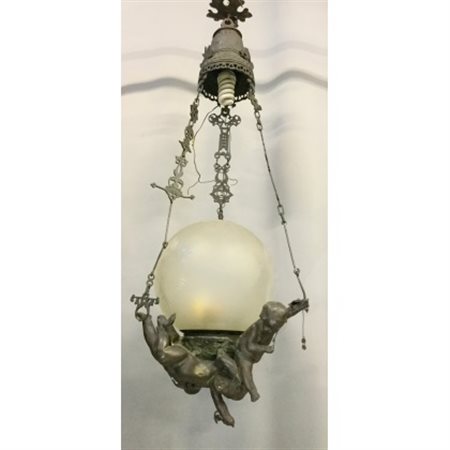 Lampada a sospensione in bronzo con amorini a tuttotondo, diffusore in vetro ac