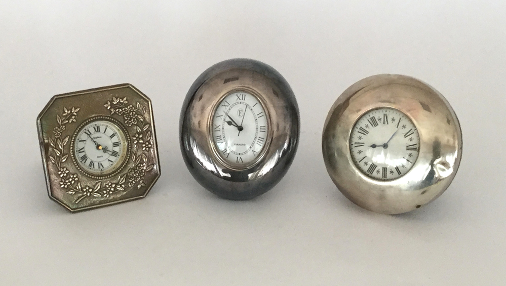 Lotto composto da tre orologi da tavola con ghiere in argento e metallo argenta