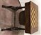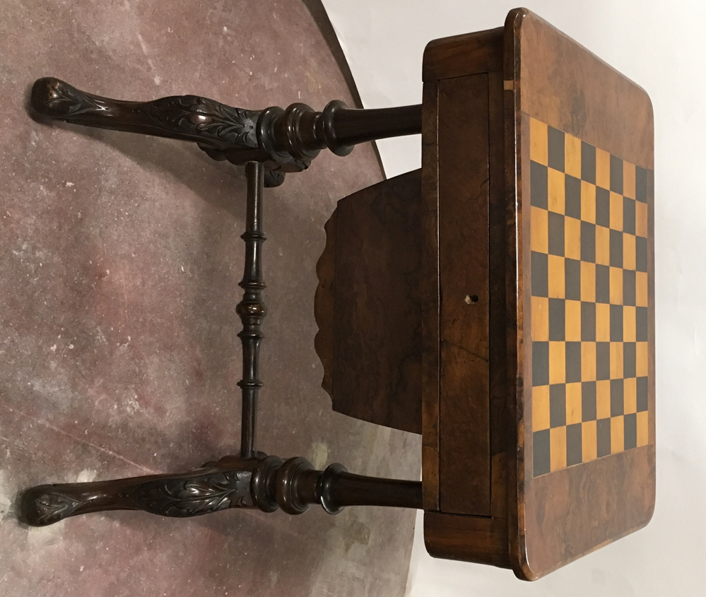 Tavolino lastronato in radica di noce ad un cassetto e un vano porta oggetti. Piano decorato a scacchiera, piedi sagomati e intagliati muniti di rotelle. Inghilterra fine sec XIX (cm 56x70x40) (difetti e mancanze)